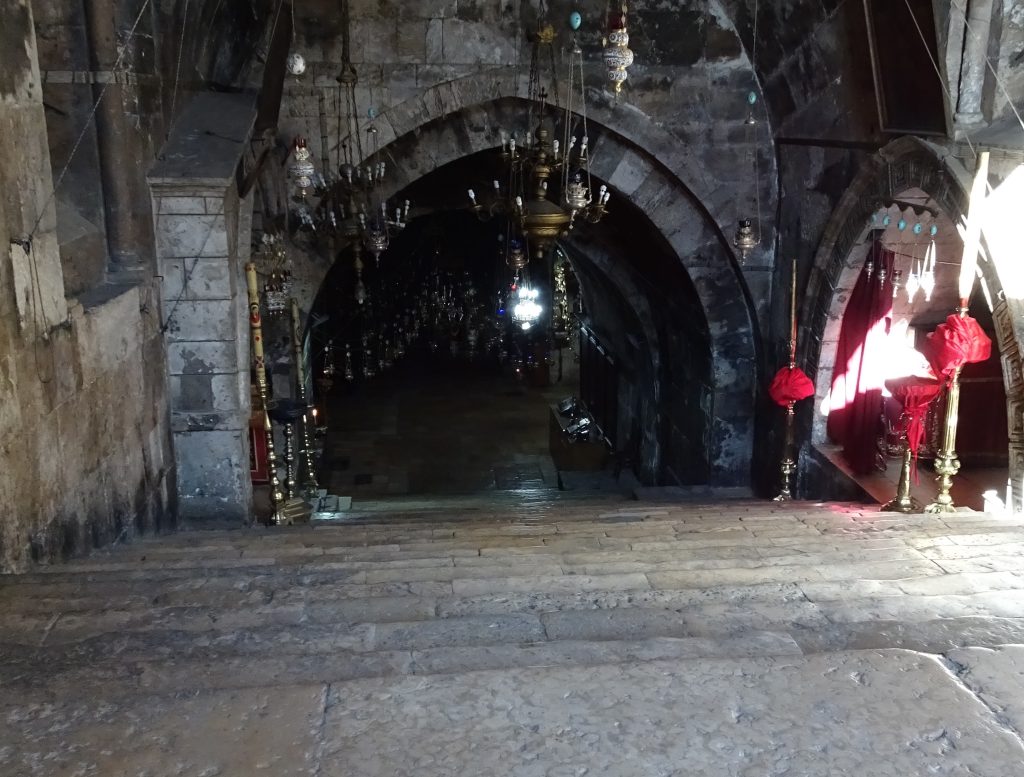 A monument was erected in the 5th century but destroyed in 614. The facade is from the time of the Crusades. You go down 47 very wide steps into the dim interior, arriving at the site of a 1st century rock-cut tomb. It is a place of extraordinary spiritual presence. I could well imagine that it was exactly here that the first Christians buried the mother of their Lord, using one of the rock-tombs in the Jewish cemetery by the river Kidron.