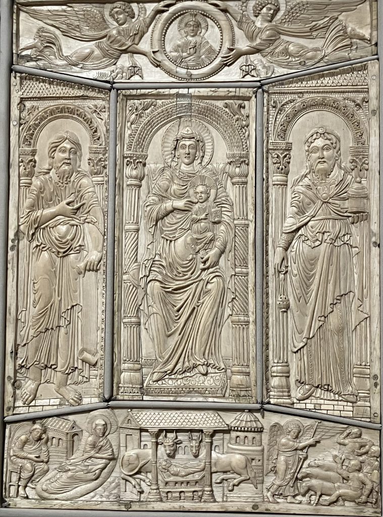 2 *Ivory cover of Gospel book c.800, Mary in centre.